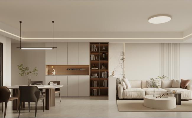 本設計以現代輕奢為核心,融合法式輕奢的精致線條與現代家居的實用功能??筒蛥^采用開放式布局,米白色護墻板搭配大理石紋理飾面,勾勒出優雅的空間基底;焦糖色絨布餐椅、寶藍色單椅形成撞色視覺焦點,金屬雕花、水晶裝飾等細節點綴其中,糅合了奢華質感與現代簡約。自然花藝與藝術擺件的融入,讓空間在精致奢華中兼具生活溫度,打造出兼具儀式感與舒適度的現代家居體驗。