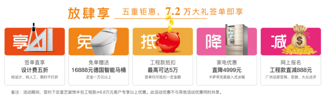 當裝修遇上小長假,讓優質與優惠齊飛。五重鉅惠,7.2萬簽單大禮放肆享?;ㄒ粯拥腻X裝修,享受更好的家居品質。