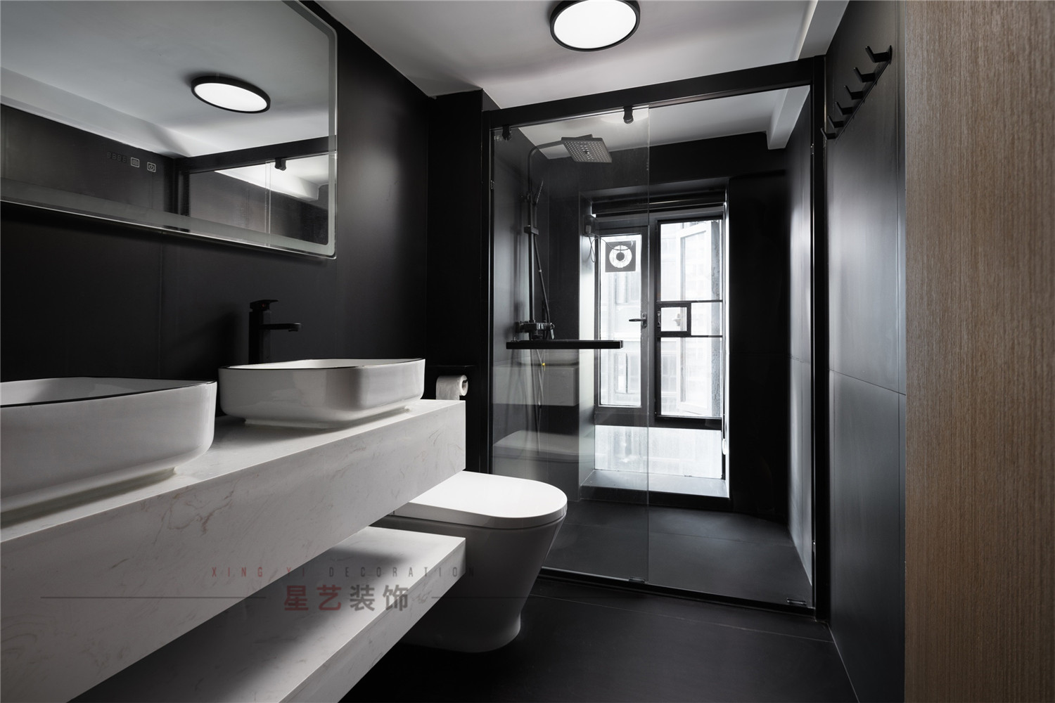 二樓的衛生間采用莊重肅穆的風格,大面積的黑白搭配設計帶來強烈的視覺沖擊,而一樓的衛生間卻自然簡約,好像是走進了清風徐徐得田野上,把人帶回到兒時的記憶。