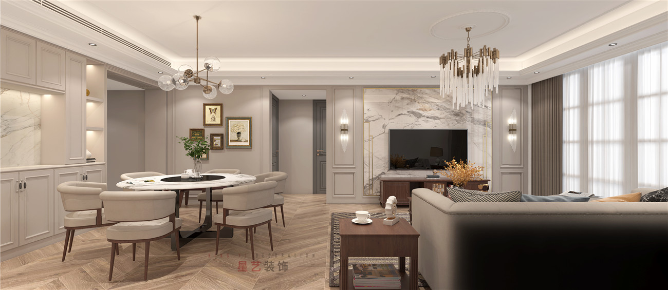 客廳作為主要的待客區,進了門就可以看到主要的休閑區和用餐區,因為整體空間上會比較低矮平和,所以在選材上也會偏向于舒適,柔軟,溫馨的材質組合,可以建立出溫馨的家庭氛圍,兩種的不同精致華麗得吊燈也為客廳和用餐區劃分出區域。