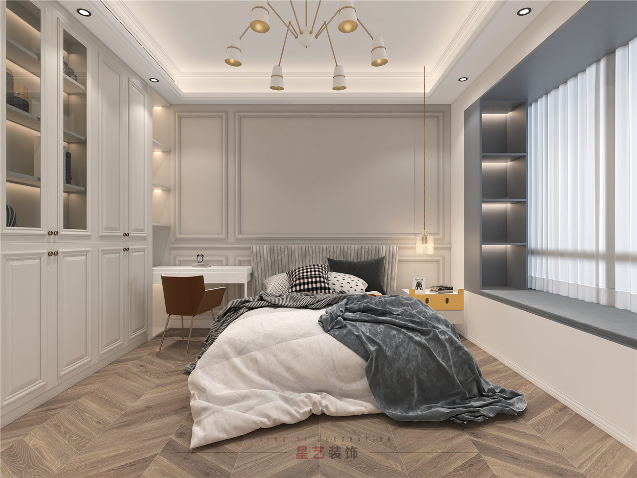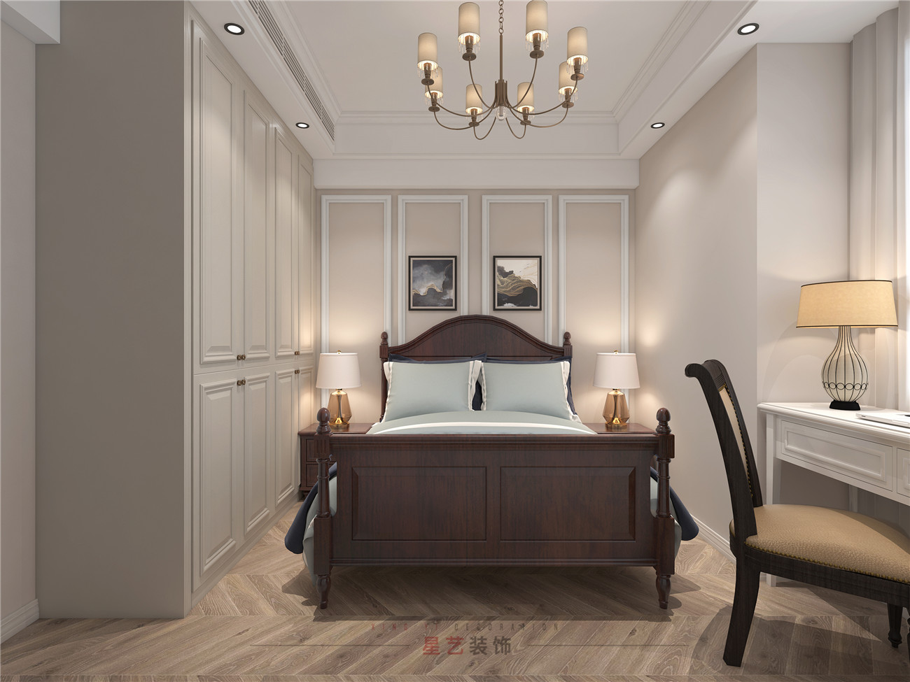 保姆房稍微小一些,但總體來說也是簡約舒適,主要采用藍灰色為主。房間有不同風格的美式吊燈,增加每個空間的奢華感,精致感,讓每個家庭成員都能在這樣溫暖舒適的環境中找到家的歸屬感。
