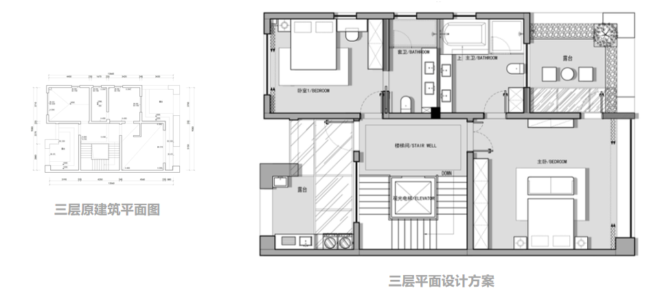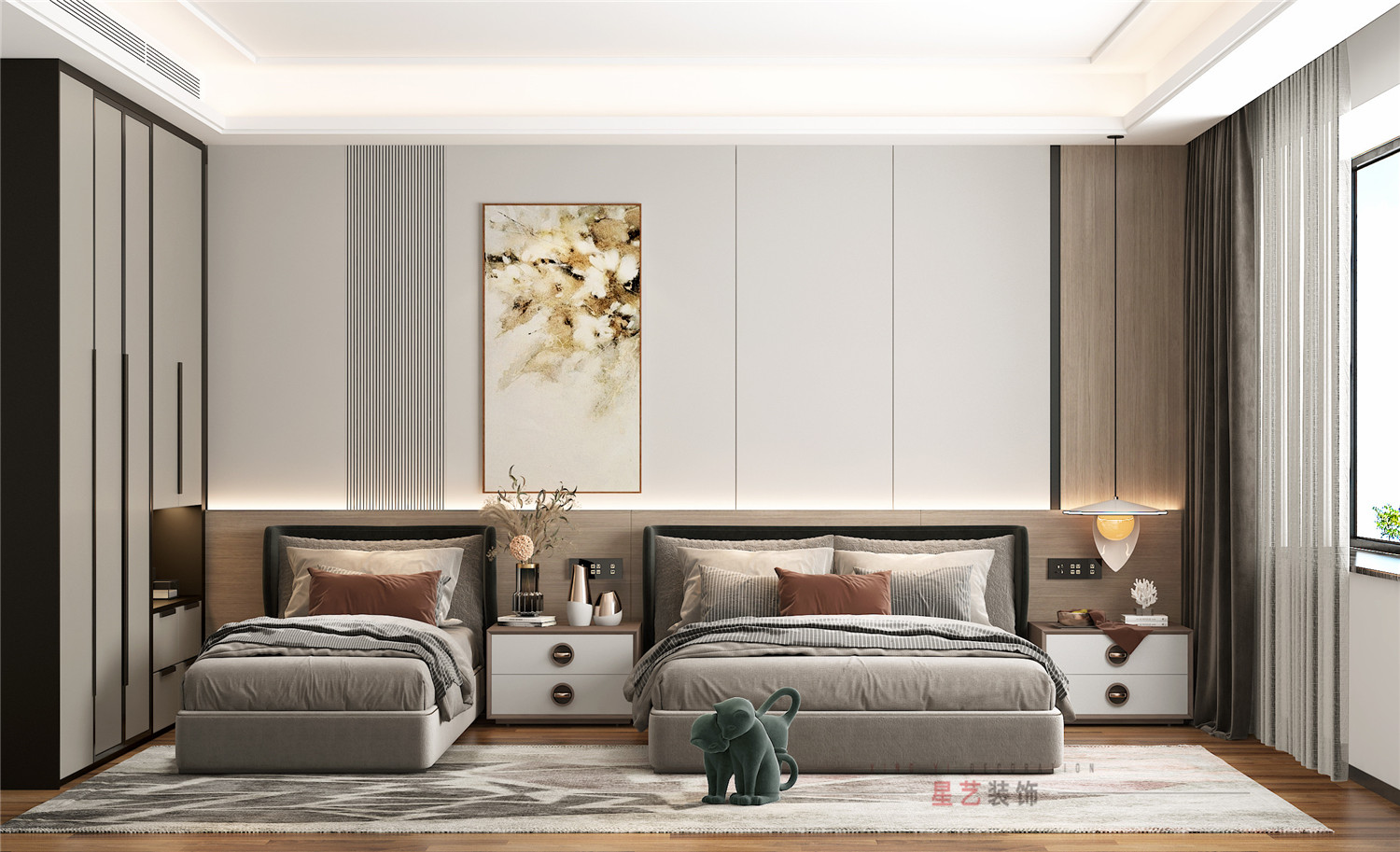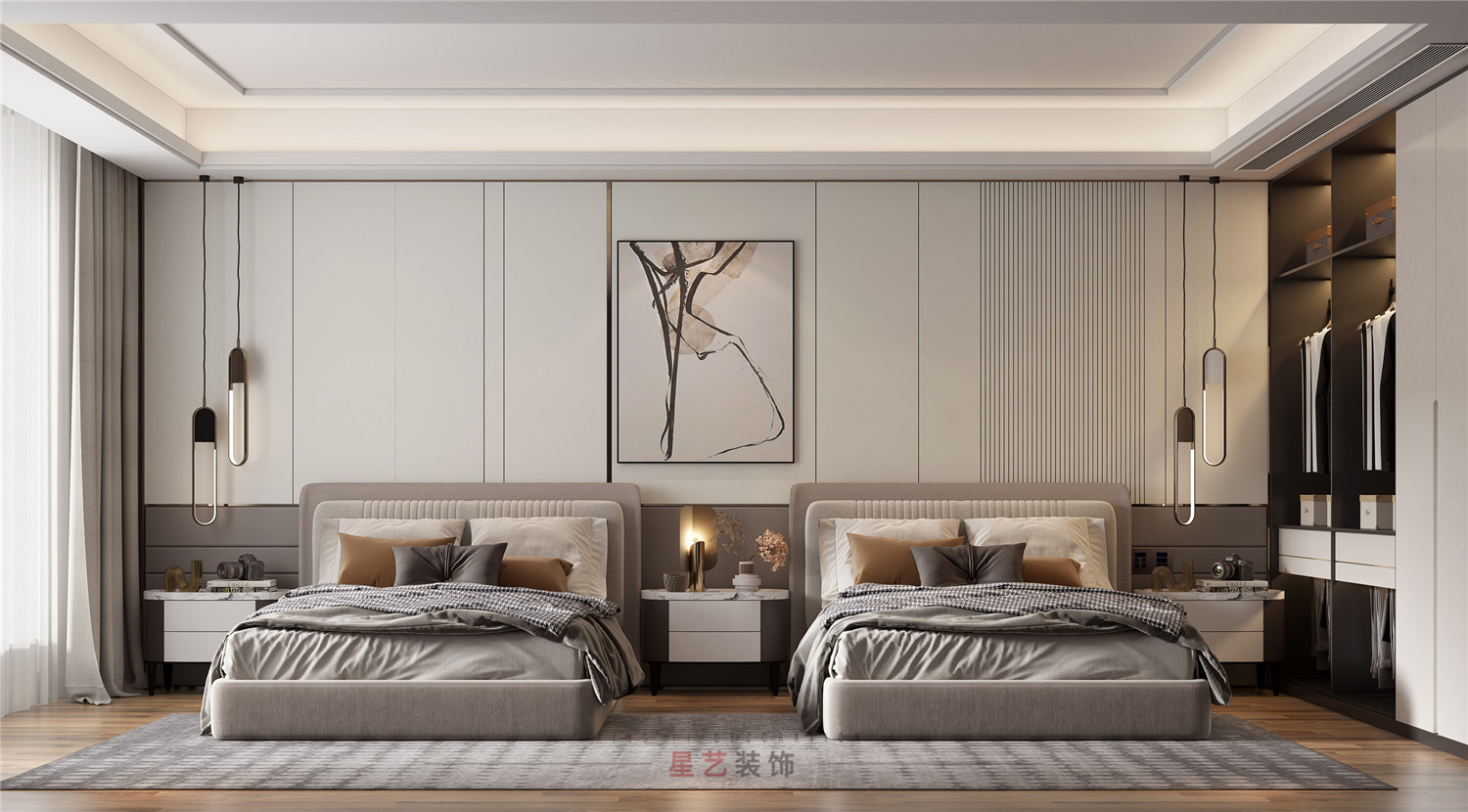 主臥用大面積灰調與對稱的設計,沉穩高級。簡約之中,又有無盡的雅致與濃厚的生活氣息。