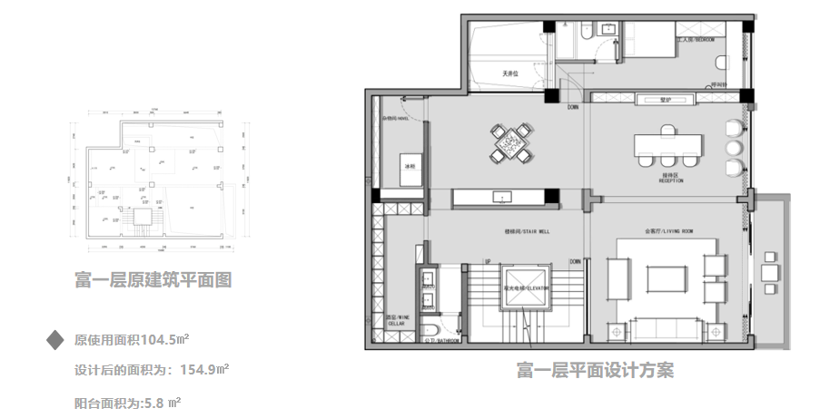 客廳主要以素雅的米白色為色彩基調, 黑白灰的經典搭配打造現代輕奢的舒適與高級感,一眼便能看到部分二樓的場景和貫穿樓層的透明電梯,讓空間更加開闊,靈動活潑。
