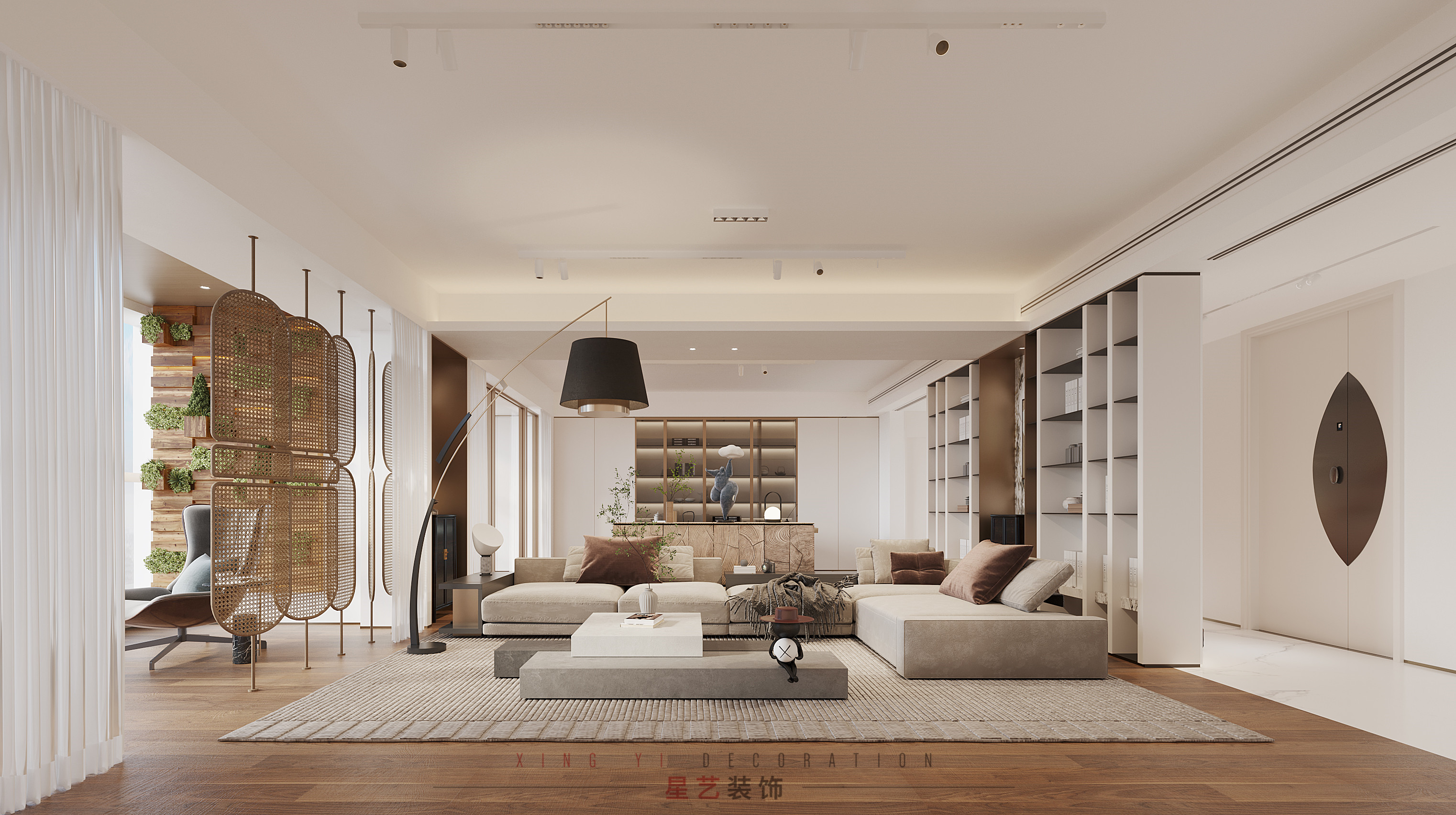 板正的沙發,淺淺的燕麥色,給人以自然的溫暖,左側是藤編屏風,自然舒適的感觀,微風徐來之時,宛若置身東南亞。